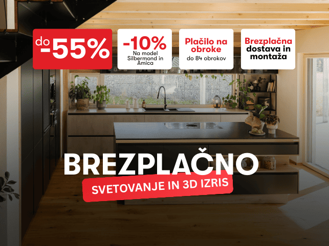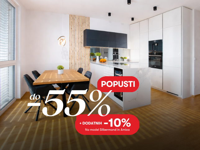 Izkoristite do 55% popusta na izbrane modele kuhinj in dodatne ugodnosti pri izbranih modelih.