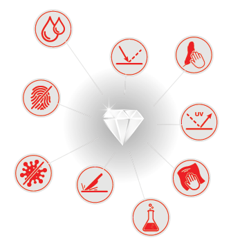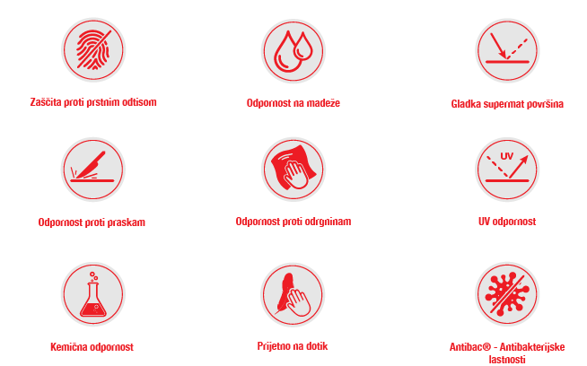 Pomembno prednost nove linije DIAMANT predstavlja sistem zaščite Antibac® z antibakterijsko zaščito, ki poskrbi, da se v svojem domu vedno počutite varno in nimate nenehnega občutka, da so na površini neželeni virusi in bakterije.