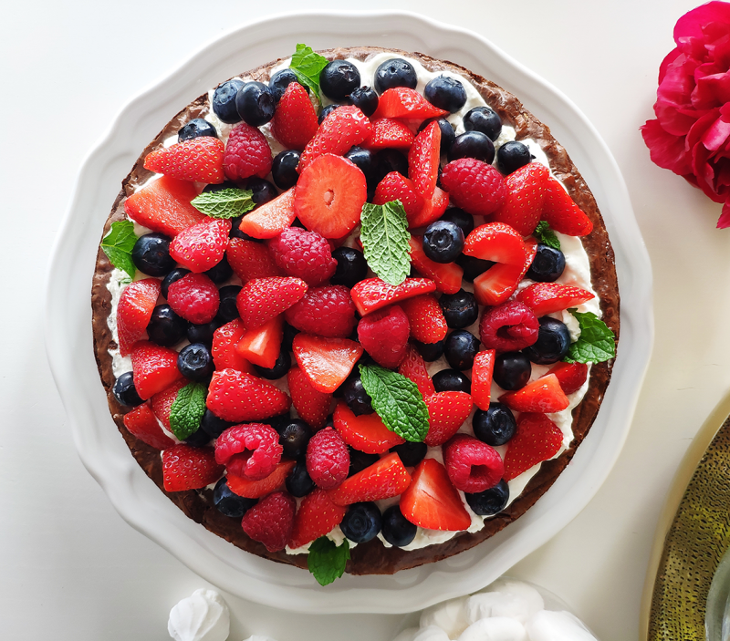 Na parni kopeli stopimo na rezine narezano maslo in mu dodamo koščke čokolade. Ko dobimo homogeno zmes jo odstavimo in ohladimo. V skledi penasto vmešamo jajca in sladkor. Moko in kakav premešamo in počasi dodamo v zmes jajc in sladkorja. Na koncu dodamo še čokoladno zmes in čokoladne solzice. Pečico segrejemo na 180 stopinj. Tortni pekač premažemo z maslom in vanj vlijemo maso. Pečemo 30 minut. Torto ohladimo in vzamemo iz pekača ter pred serviranjem dekoriramo s stepeno sladko smetano in posujemo s sezonskim sadjem.
